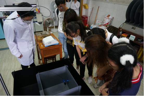 工作人员还向大家展示了脑科学研究中的两种模式生物——果蝇和小鼠。在果蝇实验室,参观人员在显微镜下观察了果蝇的形态并学会了区分果蝇的性别。在动物行为学实验室,工作人员现场演示了小鼠的旷场实验和利用光纤刺激脑细胞的过程。