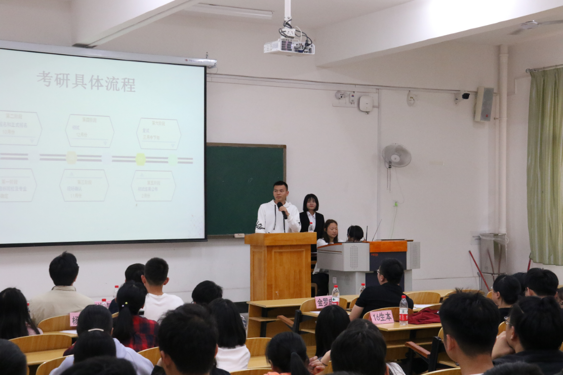 为增强学生的考研信心与动力,5月10日晚,生物技术学院2019年“筑梦全新时代、研续青春梦想”考研经验交流会在临桂校区N103教室举行。学院党总支副书记谢勇志,班级导师高进涛、于鸿浩,辅导员金罗成、李思婧,16升本考研同学和17升本、18升本全体同学参加了本次交流会。