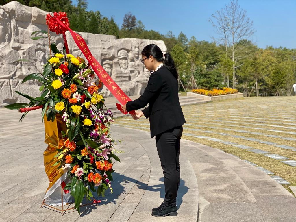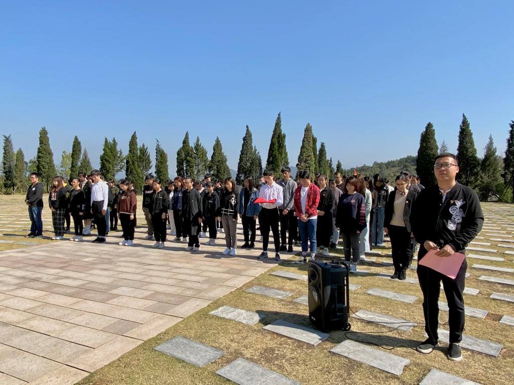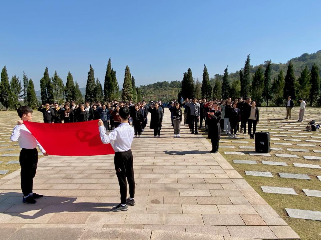 从纪念馆出来,全体师生沿山坡而上,这里是当年湘江战役三大阻击战之一脚山铺战场遗址所在地,部分湘江战役红军烈士遗骸安葬在此处,真正是“一草一木一忠魂、一山一石一丰碑”。大家缓缓地走在山路上,一路瞻仰一路缅怀。来到凭吊广场,师生们向革命烈士敬献花篮、瞻仰群雕《红军魂》、举行了庄严肃穆的缅怀悼念仪式,面向党旗重温入党誓词,预备党员亮身份做承诺,传承革命精神,从中汲取砥砺前行的力量。