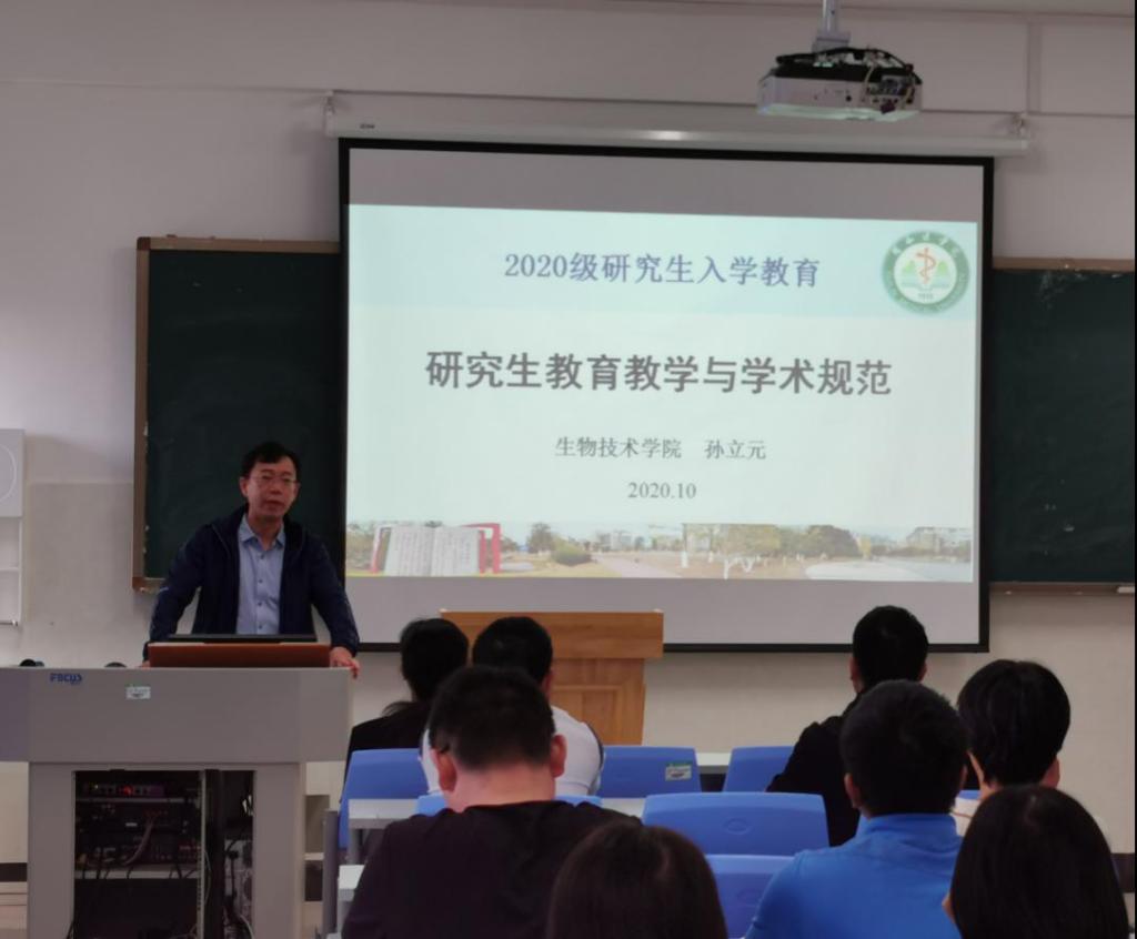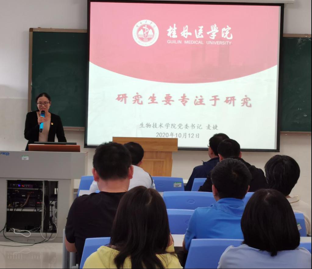 生物技术学院党委书记麦婕首先代表生物技术学院欢迎2020级研究生的到来,随后介绍了桂林医学院及生物技术学院办学历史和发展现状,通过对老一辈科学家的精神学习,提出了作为当代研究生应该具备的科研素养与精神。生物技术学院院长孙立元对本学科研究生的培养目标以及培养规划进行解读,并对科学研究过程中必须遵守的学术规范进行了详细讲解。生物技术学院分管研究生工作副院长武家才对本学科研究生培养方案作了介绍,并从课程设置、专业实践、研究生考核、学位授予等方面做了详细的解释和分析。
