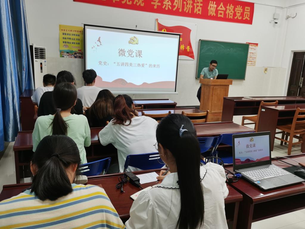 支部书记刘启亮首先组织大家观看微党课视频,学习党史故事“五讲四美三热爱的由来”,其主要内容为:“五讲”:讲文明、讲礼貌、讲卫生、讲秩序、讲道德;“四美”:心灵美、语言美、行为美、环境美;“三热爱”:热爱祖国、热爱社会主义、热爱中国共产党。“五讲四美三热爱”活动是为了建设社会主义精神文明,在新的历史时期创造的群众性活动,通过学习“五讲四美三热爱”,引导学生党员在思想和行动上积极支持创城工作,共创文明城市。