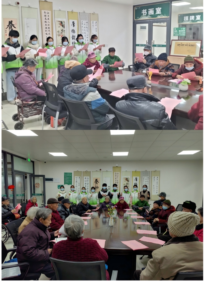 志愿者们围坐会议桌旁,聆听老人讲述往昔经历与岁月智慧,或曲折或温暖的故事,深受触动。随后,全体志愿者朗诵诗歌《生命的每一刻都是崭新的起点》,引发老人强烈共鸣。为提升老人心理健康意识,学生们还进行了知识普及。活动在《难忘今宵》的合唱中圆满结束,现场气氛热烈温馨。