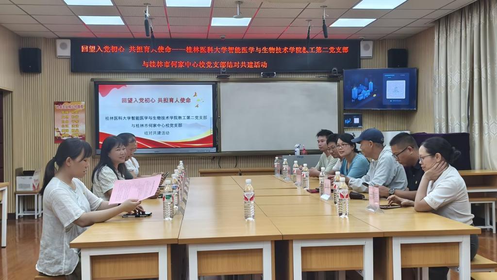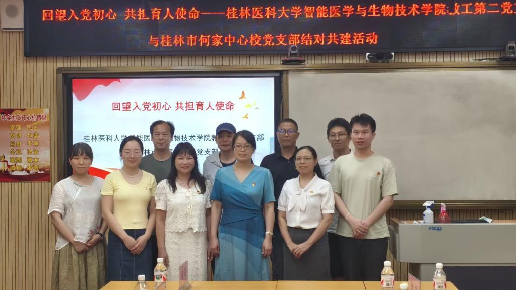 为进一步加强基层党组织之间的交流与合作,助力大中小学思政课一体化建设,6月25日,智能医学与生物技术学院教工第二党支部怀着对教育事业的热忱与担当,走进桂林市何家中心校,与该校党支部共同开展“回望入党初心 共担育人使命”主题党日活动。学院团委负责人及学生党员代表参加活动。