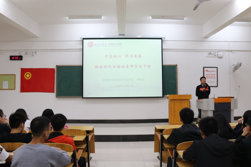 生物技术学院党总支谢勇志副书记以“不忘初心,不负青春,做新时代合格的青年学生干部”开篇,通过讲述几个发生在校园、发生在身边的几个活生生的例子,对如何当好一名学生干部,如何强化学生组织,发挥好先进堡垒和模范带头作用,提出了自己的建议:戒除不良习气,充分发挥正能量;强化服务意识,履行全心全意为同学服务的宗旨;建立团队精神,勤学苦练,团结协作;筑牢规矩意识,识大体、懂分寸、明尺度。