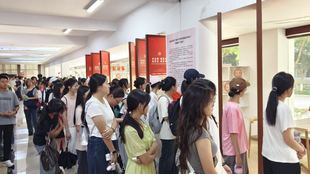 活动首站,新生们来到大学生党建文化中心。庄严肃穆的红色文化墙、党建书籍和桂医特色文创产品,迅速吸引了大家的关注。老师在讲解中鼓励同学们积极向党组织靠拢,以理想为帆、信念为舵,在青春征程中践行初心使命。