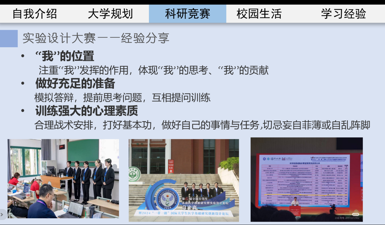 活动中,三位宣讲人依次从各自独特的成长轨迹出发,为学弟学妹们展现了多姿多彩的大学生活。刘雄祥以自己丰富的履历为切入点,将参与校内外活动的精彩故事娓娓道来,用自身经历鼓励同学们大胆走出“舒适圈”,在社团实践、志愿活动等多元场景中锤炼本领,让大学生活绽放出绚丽色彩;吴佳佳则用一张张荣誉证书串联起奋斗之路,结合丰富的公益活动经历,生动诠释了“大学是实现无限可能的舞台”,传递出“只要不懈努力,人人皆可出彩”的坚定信念;姚雅馨聚焦学术科研领域,毫无保留地分享精心规划的大学蓝图,不仅鼓励同学们积极投身科研竞赛提升专业素养,还细致入微地传授了高效学习方法与技巧,引得屏幕前的同学纷纷点赞。