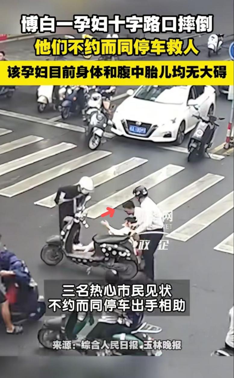 广西玉林博白县街头,沈旺驾车等候红绿灯时目睹一名孕妇骑电动车不慎摔倒。他第一时间下车冲向孕妇,与另外两名热心市民一起向孕妇伸出援手,确认孕妇没有严重受伤后,为防止造成交通堵塞,及时将孕妇转移至路旁台阶休息并主动提出开车送孕妇就医,但孕妇表示家属就在附近,很快就会来到,三人坚持陪护直至家属赶来。同时,沈旺轻声安抚孕妇情绪,观察孕妇状态,引导其调整呼吸节奏。经医院检查,孕妇因救助及时未出现严重症状,目前在医院接受保胎治疗。面对“扶不扶”的道德考验,沈旺说:“救人时也没有想太多,这对医学院校毕业的学生来说是理所应当的。”孕妇表示:“感谢他们毫不犹豫冲上来,世界上还是好人多。”