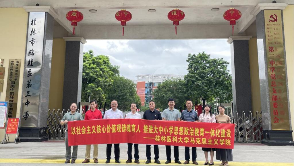 为推进大中小学思政课一体化建设,开展铸牢中华民族共同体意识教育,发挥校校合作的育人功效,6月16日上午,马克思主义学院赴临桂区第三中学开展“党建引领、铸牢同心”结对共建活动。马克思主义学院院长吕卫华、副院长刘朝华,临桂区第三中学党总支书记王远屏、校长秦开孙,双方教师代表参加活动。活动由学院二级组织员莫丽琴主持。