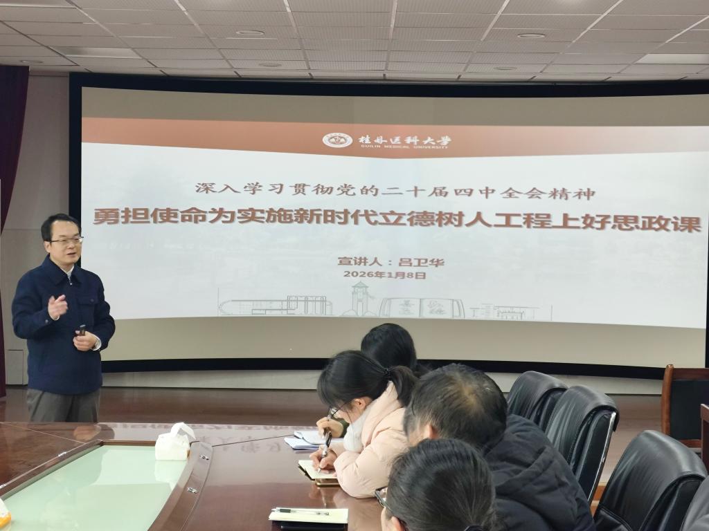 1月8日,学习贯彻党的二十届四中全会精神桂林医科大学宣讲报告会(马克思主义学院专场)在人文楼316会议室举行,马克思主义学院党委副书记、院长吕卫华作宣讲报告,学院党政领导班子成员、全体思政课教师参会。