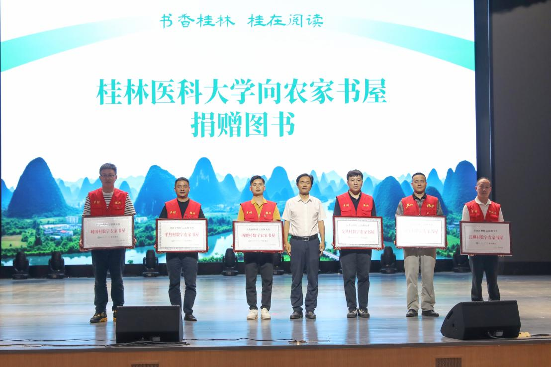 与会嘉宾共同欣赏了舞蹈《书简》和朗诵《读书如读人》,品味传统文化带来的魅力。活动中,我校的越南、柬埔寨留学生与中国学生一起宣读“全民阅读”活动倡议书。为进一步助力乡村文化振兴,我校还向定点帮扶的龙胜各族自治县6个村的农家书屋捐赠纸质图书和电子图书,捐赠的线上移动图书馆包含十万册电子书和五十万集听书资源。仪式上,李清华给6个定点帮扶村的代表颁发了数字农家书屋的牌匾。