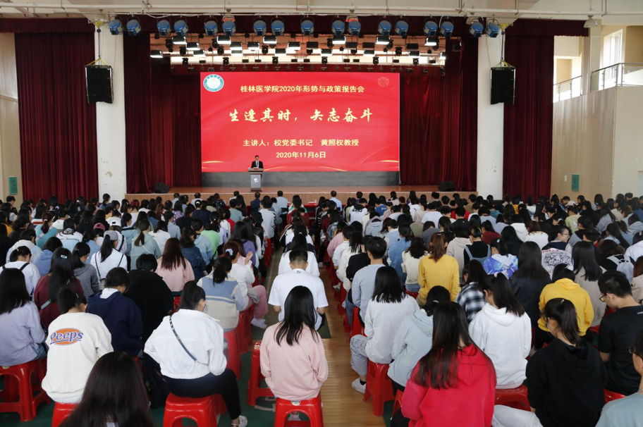 为推动广大师生深入学习贯彻习近平新时代中国特色社会主义思想,坚定“四个自信”,深入了解校史校训,厚植家国情怀,11月6日下午,校党委书记黄照权教授在临桂校区大学生活动中心作题为“生逢其时、矢志奋斗”的形势政策报告。学校党委常委、副院长、组织部部长马献力教授出席报告会,学生工作部、校团委、各二级学院等单位负责人及近千名师生代表参加了报告会。