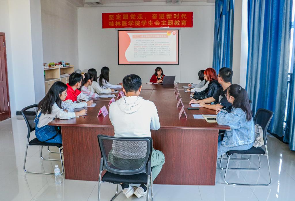 2020年10月25日下午,桂林医学院学生委员会在临桂校区大学生活动中心207会议室召开“坚定跟党走,奋进新时代”主题教育座谈会,与各二级学院学生会代表集体学习了习近平总书记致全国青联十三届全委会和全国学联二十七大的贺信精神。会议由校学生会宣传部部长李婷同学主持。