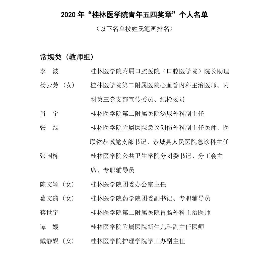 五四精神,传承有我弘扬青春的主旋律,激扬梦想守望相助抗疫情,四方一心见真情青年用实际行动践行着时代担当他们亮起青春的底色,努力奋斗他们是桂医青年的优秀代表,拼搏进取他们无所畏惧、敢为人先积极参与抗疫,成为坚定的守护者接下来,请让我们一起来领略一下独属于他们的卓越风采吧!具体名单请戳下面的图片吧~