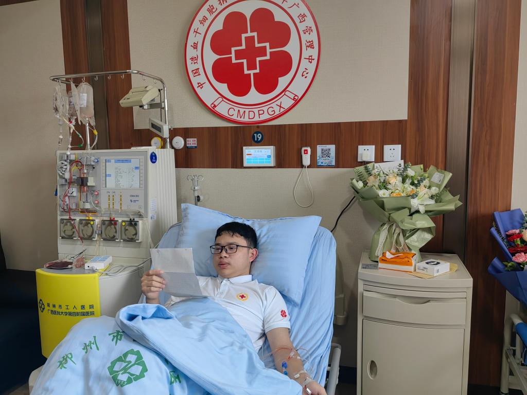 1月9日上午,在柳州一所医院的采集室,我校临床医学院2020级临床医学本科一班吴勇佑同学正在为一名素不相识的血液病患者点燃生命的火种。吴勇佑光荣地成为全国第16776例、广西第587例、桂林市第66例、桂林医学院第10例造血干细胞捐献志愿者。