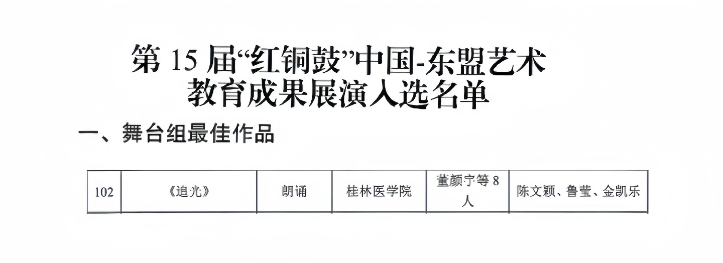 经过专家组评审、组委会审定,我校原创朗诵作品《追光》获舞台组最佳作品,并受邀参加舞台艺术类教育成果展演专题晚会。《追光》以西南剧展为线索,重温“西南剧展”的光辉历程,运用集体朗诵的艺术形式,对话古今,赓续中华文脉,传承不改初心,筑牢文化自信,激扬时代干劲。