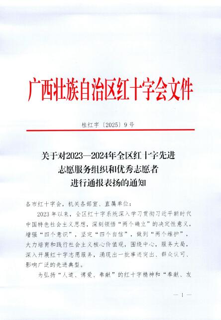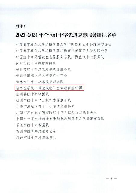 近日,广西壮族自治区红十字会发布《关于对2023-2024年度全区红十字先进志愿服务组织和优秀志愿者进行通报表扬的通知》(桂红字〔2025〕9号),桂林医学院“微光成炬”生命教育宣讲团荣获“全区红十字先进志愿服务组织”,梁锦成同学获评“全区红十字优秀志愿者”称号。