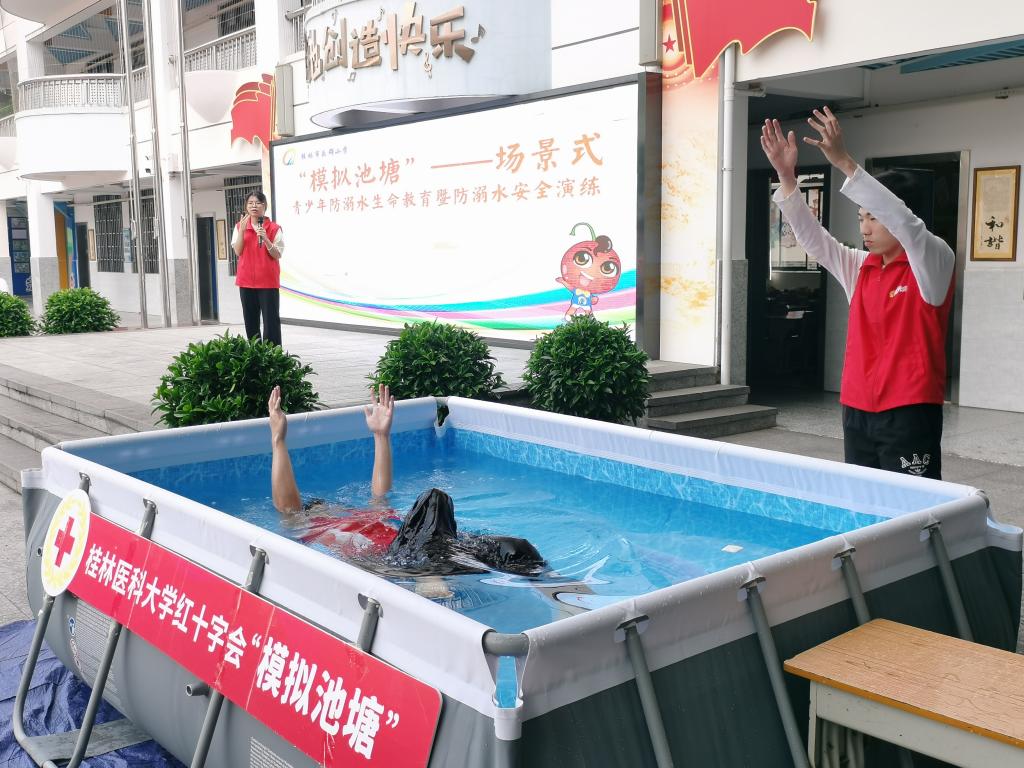 活动现场,桂林医科大学红十字志愿者搭建起径长约2米的充水式“模拟池塘”,真实还原各类溺水事故发生场景。围绕“自救”与“施救”两大主题,志愿者分步骤演示了“仰头露鼻、甩脱重物、抓握漂浮物”的自救技巧,以及“竹竿救援、衣物结绳、漂浮物抛投”等科学施救方法。