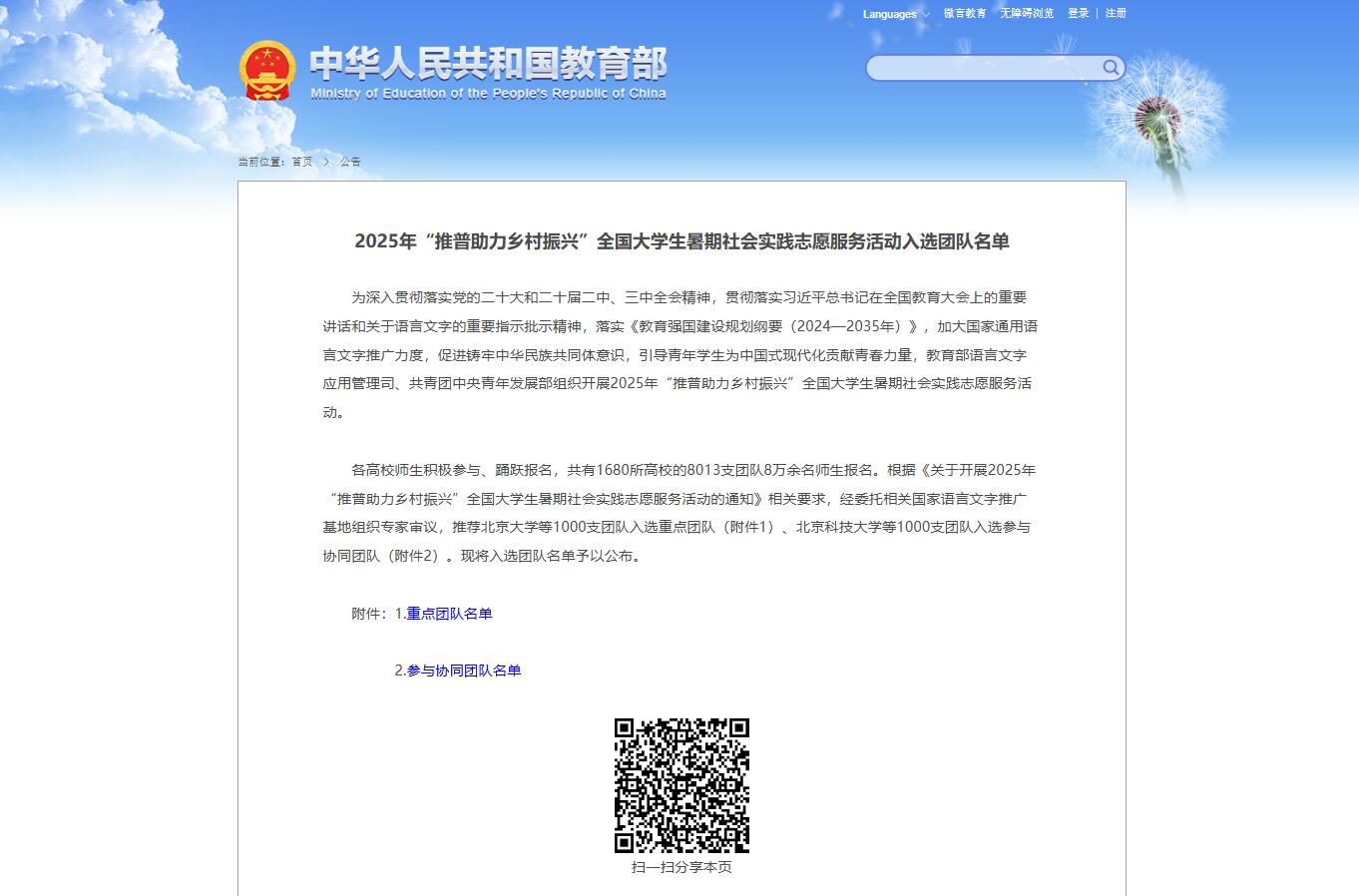 近日,教育部语言文字应用管理司、共青团中央青年发展部组织开展2025年“推普助力乡村振兴”全国大学生暑期社会实践志愿服务活动,我校“微光成炬”推普助力乡村振兴服务团入选重点团队(指导教师:沙远峰、唐静莉)。据了解,全国共有1680所高校的8013支团队8万余名师生报名。最终评选1000支团队入选重点团队,以及1000支团队入选参与协同团队。