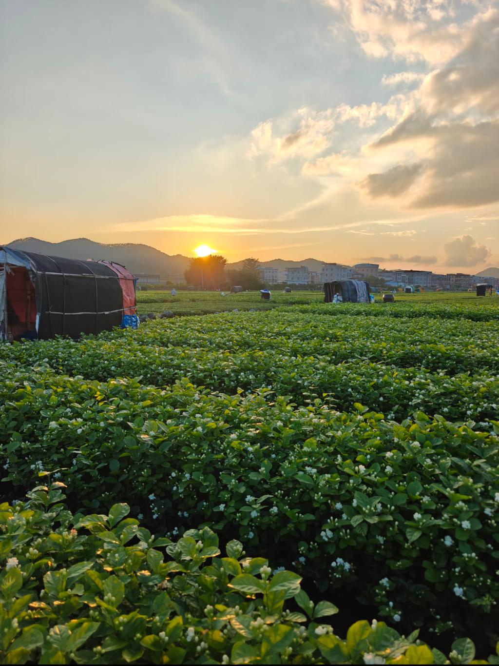 初抵横州时,恰逢茉莉盛放之季。汽车在盘山公路上迂回前行,于日暮时分驶入一片被霞光浸染的翠色腹地。忽见远山层叠之间,浮起连绵不绝的“云朵”——那不是云,是万亩茉莉正静静绽放,如雪落绿野,温柔如梦境。