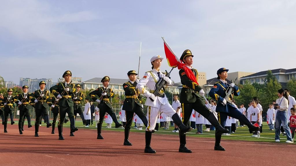 仪式中,英姿飒爽的国旗护卫队迈着矫健的步伐护旗入场,在嘹亮的国歌声中鲜艳的五星红旗冉冉升起。全体师生庄严肃立,精神饱满,怀着无比崇高的敬意向国旗行注目礼。学生代表以“高擎理想的旗帜,燃烧信念的火炬”为主题进行国旗下的演讲,用无数青春的榜样激励广大同学奋发有为,努力实现人生理想,为实现中华民族的伟大复兴而不懈奋斗。随后,全场师生挥动手中的小国旗共同唱响歌曲《歌唱祖国》,表达对祖国的热爱之情,为祖国送上最深情的祝福。