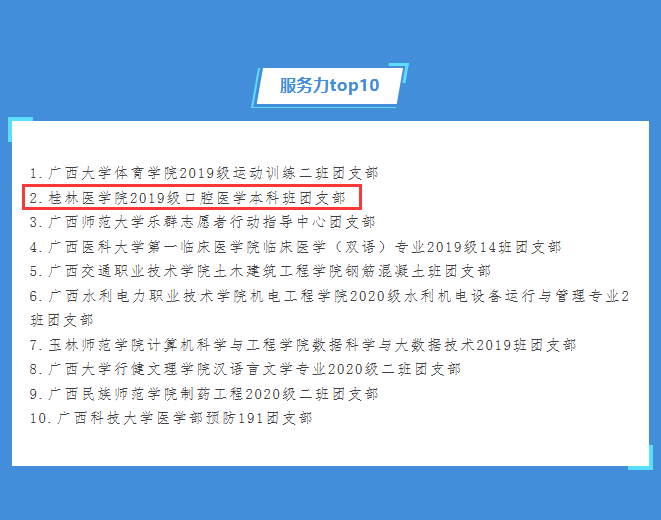 近日,团广西区委确定《2022年度广西高校“活力团支部”最具引领力(组织力、服务力、贡献度、改革味、好作风)TOP10榜》和《2022年度广西高校“活力社团”思想政治类(学术科技类、创新创业类、文化体育类、志愿公益类、自律互助类、其他类)TOP6榜》,口腔医学2019级团支部荣登“服务力top10”榜单。