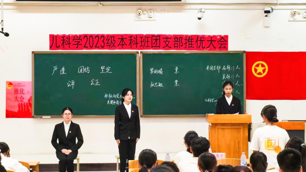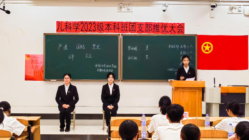 推优工作是基层团组织工作中的一项重要工作,是共青团组织充分发挥党的助手和后备军作用的重要体现,为了规范推优程序,引导各团支部积极交流学习,帮助团干熟悉和掌握推优大会的基本流程,临床医学院团委于10月18日傍晚在临桂校区教学楼北楼N103室举办2024年秋季学期推优示范大会,本次大会由儿科学2023级本科班团支部承办。出席本次大会的嘉宾有2023级儿科学本科班辅导员潘燕兰、临床医学院2022-2024级各团支部代表、临床医学院团委干事及助理。