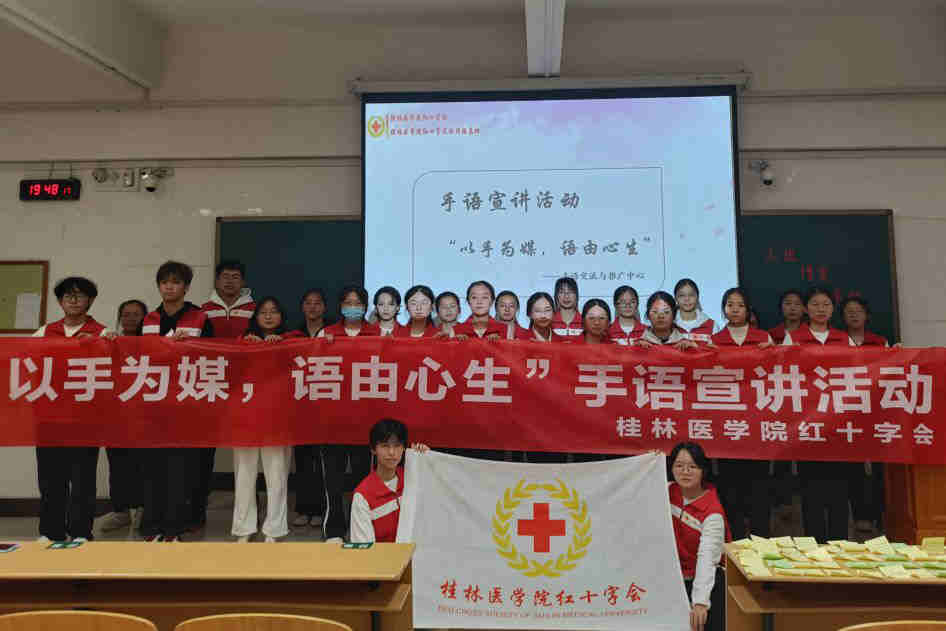 11月23日,桂林医学院红十字会在临桂校区开展手语宣讲和教学活动。本次活动包括观看视频、理论讲解、有奖竞答、手语教学和互动交流等环节,现场近百余名学员参加培训交流。