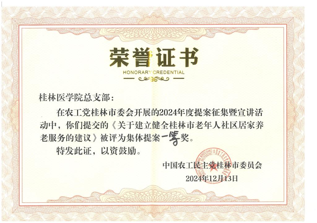 近年来,农工党桂林医学院总支在学校党委、统战部的支持下,积极服务社会,参政议政,成效显著。2024年度提案征集暨宣讲会上桂林医学院总支提交的《关于建立健全桂林市老年人社区居家养老(服务)的提案》,获得集体提案一等奖。此外,党员杨小丽、肖娟被评为“立足本职,心系农工”参政议政有心人。杨小丽撰写的《积极推动产学研深度融合 助力桂林大健康产业发展》提案获得市委领导的批示,多件提案得到相关部门的高度重视,提交的社情民意信息,其中2篇被自治区政协、区委统战部采用,多次被农工党桂林市委会评为先进基层组织、参政议政先进基层组织、宣传工作四星支部、理论写作四星支部等。充分发挥了农工党基层组织的战斗堡垒作用,为推动地方经济社会发展贡献了农工党的智慧和力量。
