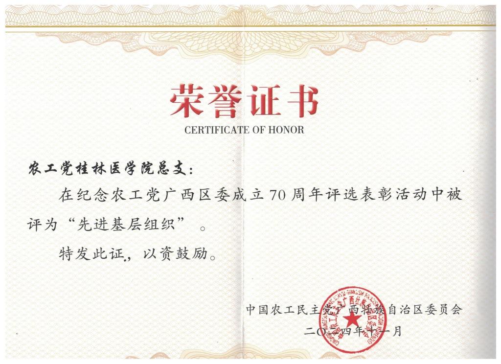 近日,农工党桂林医学院总支在中国农工民主党广西壮族自治区委员会成立70周年纪念评选表彰活动中被评为“先进基层组织”,蒋海萍获“优秀党员”称号,总支21名党员加入农工党党龄超过30周年的党员荣获纪念章。