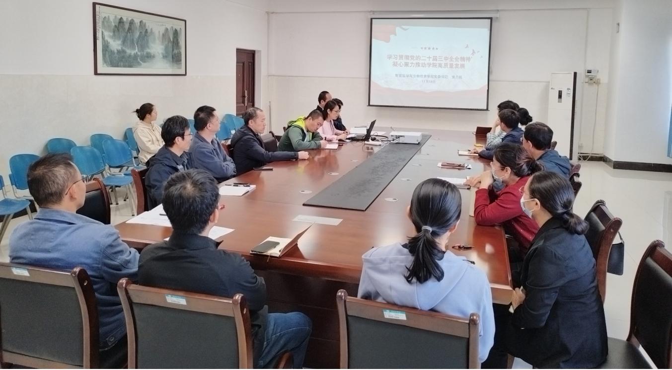 会上,黄月圆以“学习贯彻党的二十届三中全会精神 凝心聚力推动学院高质量发展”为题,围绕全面把握党的二十届三中全会精神,推进教育科技人才体制机制一体改革,加强新时代统一战线工作等三个方面领学党的二十届三中全会精神;细胞与遗传学教研室主任付灿介绍先进基层教学组织事迹;智能医学工程教研室主任杨铁军、青年教师刘学敏介绍青年导师制实践体会。