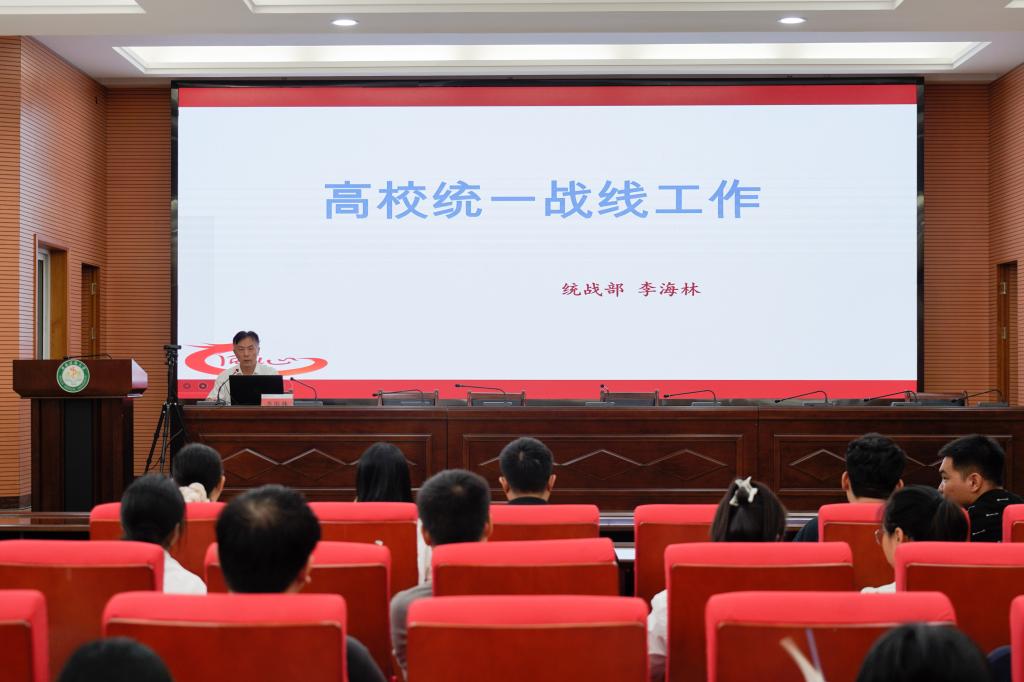为切实提升新进教职工对统一战线工作的认知理解,明晰统战领域意识形态工作面临的新形势与新要求,我校在临桂校区明德楼一楼会议室举办高校统一战线工作专题培训会。培训会由学校党委常委、统战部部长李海林主讲,近两年新进教职工参加培训。