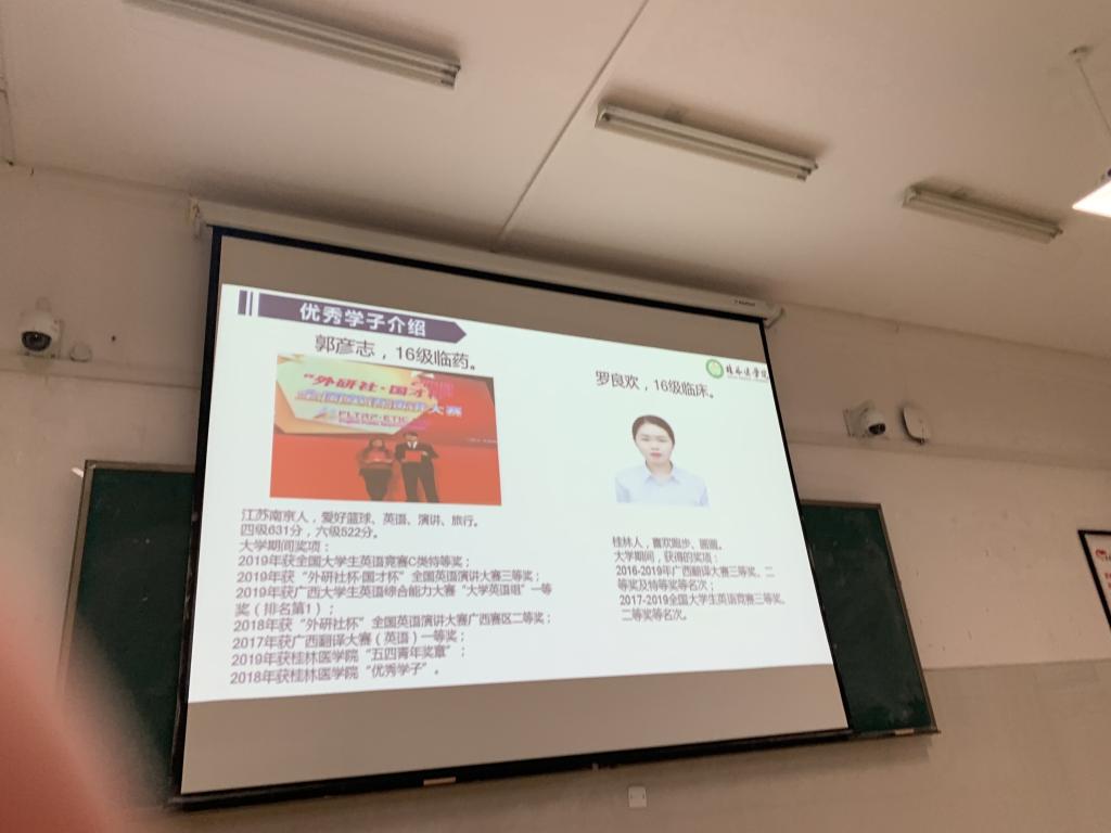 本次英语经验交流会是2021年桂林医学院第五届外语文化周的重要活动,邀请到了郭彦志、罗良欢、吴昊、庞英琪四位同学,他们依次对自己在英语学习方面的经验心得与大家进行了分享。