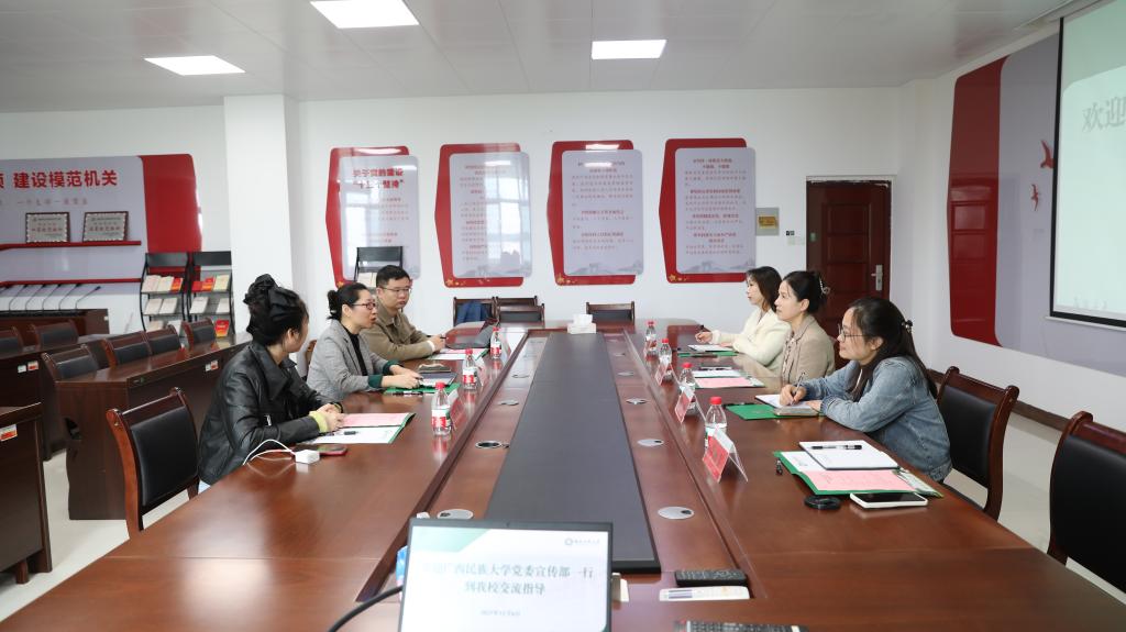 11月6日,广西民族大学党委宣传部副部长孙寿媚一行到我校进行调研交流。学校党委宣传部部长麦婕会见了孙寿媚一行,副部长刘燕及综合科、新闻中心相关同志参加调研会,副部长金罗成陪同参观了校史馆。