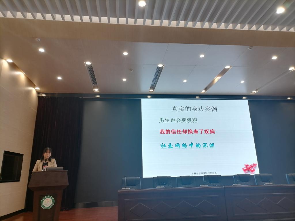 为营造一个知艾防艾的校园氛围,号召广大高校学生学习艾滋病防治知识,积极参加预防艾滋病宣传教育活动,提高大学生人群抵御艾滋病的意识和能力,2020年11月8日下午15:30桂林市防艾办周芸主任应邀走进桂林医学院开展艾滋病防治知识讲座,学工处相关领导,学生管理科全体老师,以及我校非实习班级的班干代表300余人,参加了学习培训。