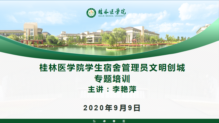 为强化“三全育人”功能,推动宿舍文化建设,9月9日晚8点,学工处管理科李艳萍、曾伟老师组织了“桂林医学院学生宿舍管理员文明创城专题培训”。培训由李艳萍老师主讲。