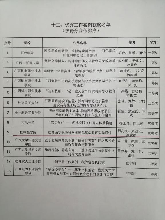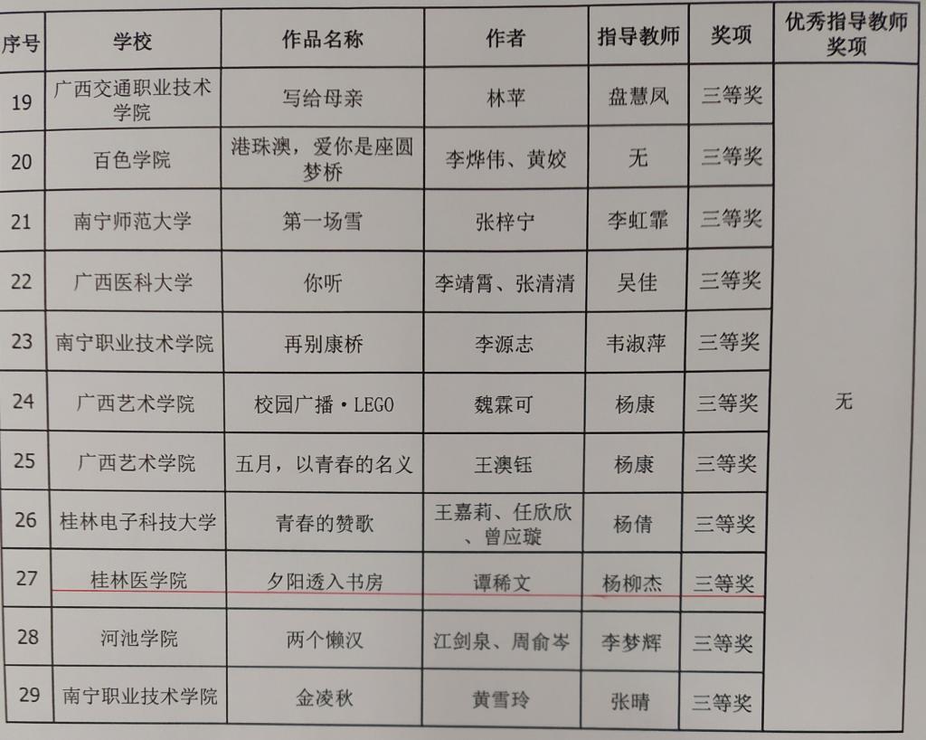 2019年,在由区教育厅会同区党委网信办主办的第六届全区大学生网络文化节和2019年全区高校网络教育优秀作品推选展示活动中,我校6项作品获奖。其中,二等奖1项、三等奖5项、优秀指导教师奖1项。