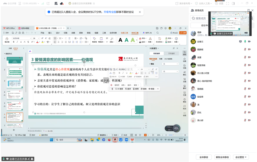 为进一步提升心理健康教育课程质量,强化课程育人功能,2月24日晚,心理健康教育教研室通过腾讯会议组织召开2026年春季学期第一次集体备课活动,来自校内各部门及两个附属医院的全体专兼职心理健康教师共同参加。