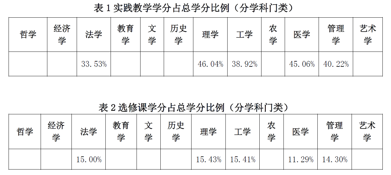 2021-2022学年,学校共开设本科生公共必修课、公共选修课、专业课共975.0门、3126.0门次。各学科实践教学学分、选修课学分,分别占总学分的比例如下: