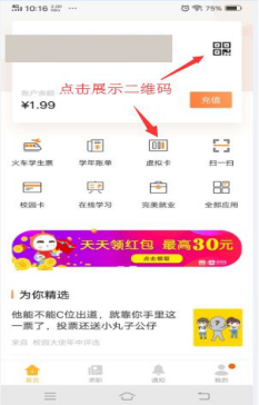 第六步:消费及身份识别,点击右上角二维码标志或虚拟卡,生成二维码,在消费机上即可刷码扣费。