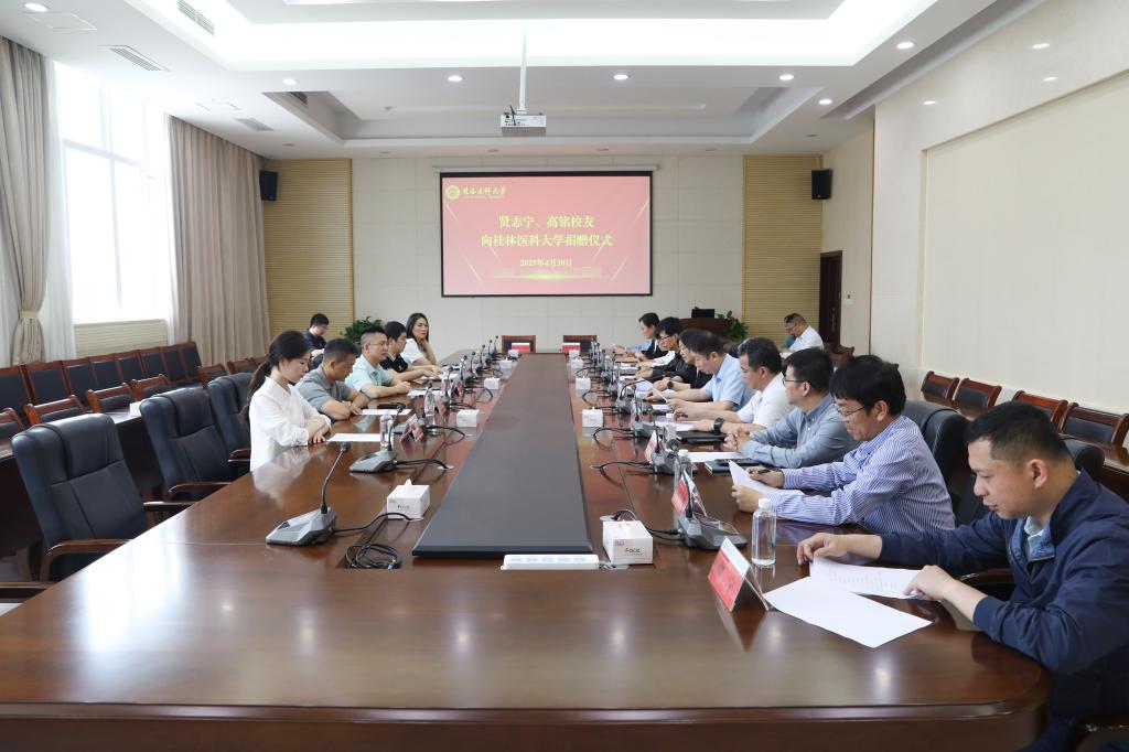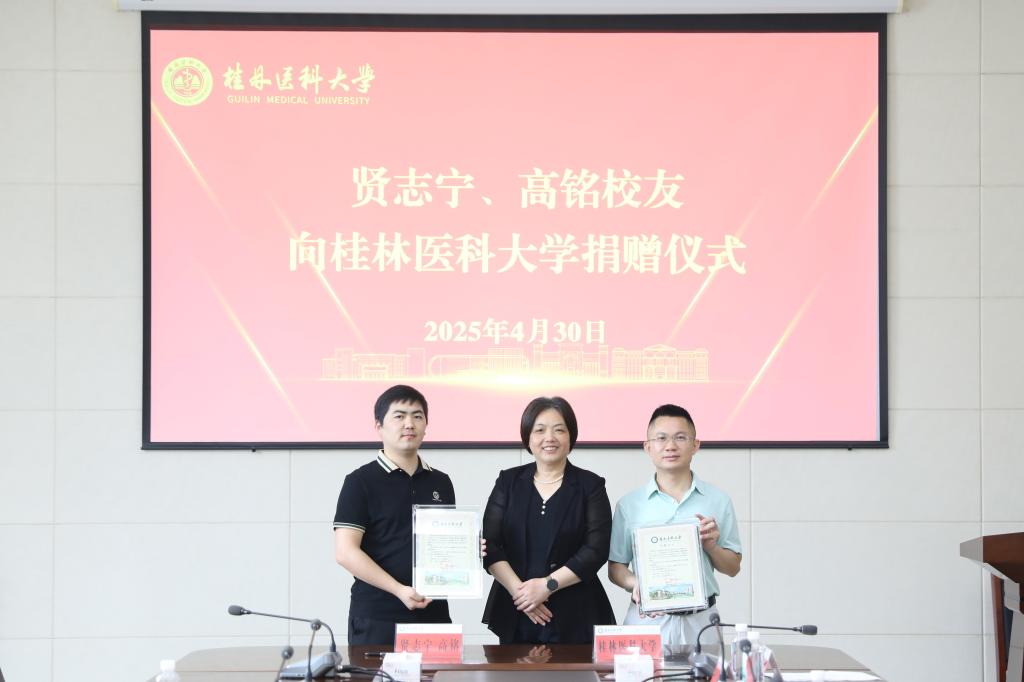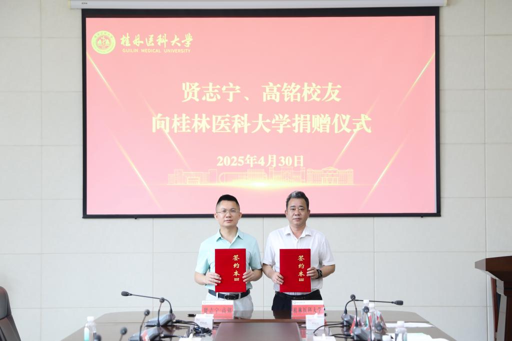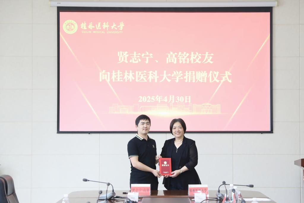 4月30日上午,一场凝聚感恩与传承的捐赠仪式在我校临桂校区明德楼502会议室举行。广西丹枫投资有限公司董事长、2002级药学专业杰出校友贤志宁,公司总经理、荣誉校友高铭怀着赤子之心,慷慨捐资400万元助力桂林医科大学发展建设,以实际行动彰显对教育事业的深情守望与有力支持。校长曾小云及相关部门负责人共同见证这一重要时刻,副校长陈健主持仪式。