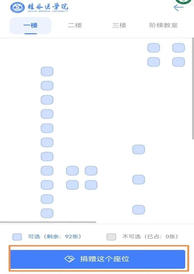 2.点击首页界面的“捐赠项目”进入下级界面,点击“人生图书馆桌椅认捐项目”进入下级界面,再点击“捐赠这个项目”进入座位选择界面。