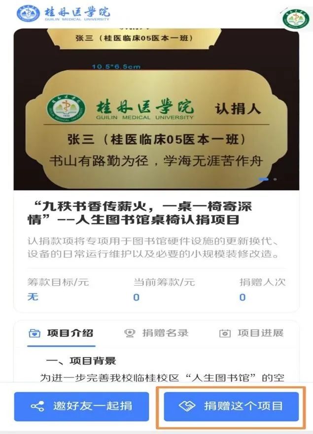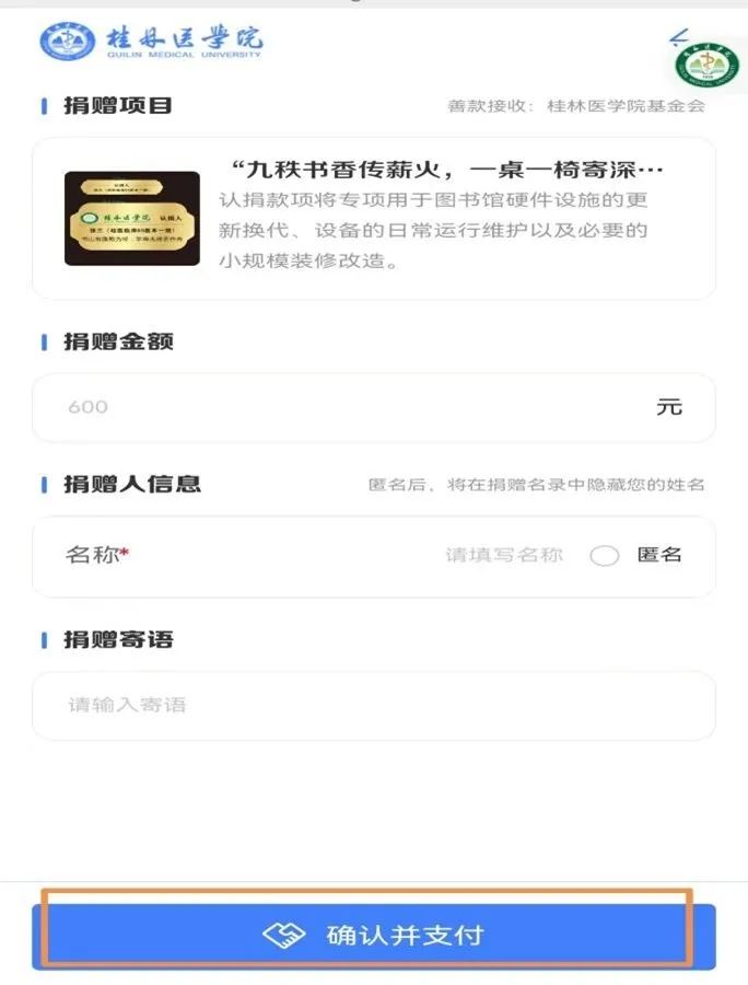 3.点击“捐赠这个座位”,填写捐赠人信息(例如“2005级医本二班张三”)、捐赠寄语(10字左右),确认信息并完成支付,认捐就成功啦!