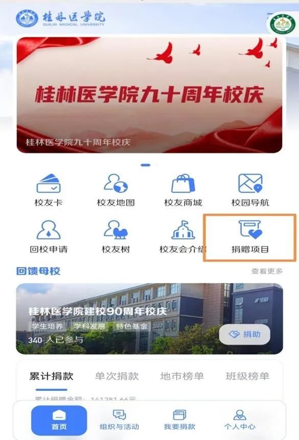 1.微信搜索并关注“桂林医学院校友会”公众号,或直接扫描下方二维码, 点击界面底部“智慧校友”进入平台。