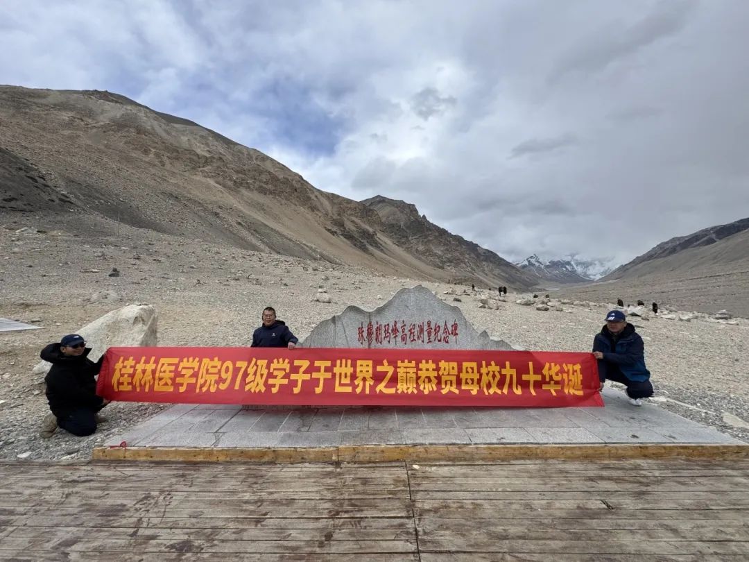 2025年3月12日,在世界屋脊的壮阔之地,珠穆朗玛峰大本营迎来了特殊的访客——桂林医学院1997级临床医学本科专业的林辉荣、谭适、陆昌运等校友。他们带着对母校深深的眷恋与牵挂,跨越万水千山,相聚于此,只为在这离天空最近的地方,为母校建校90周年送上最真挚的祝福。