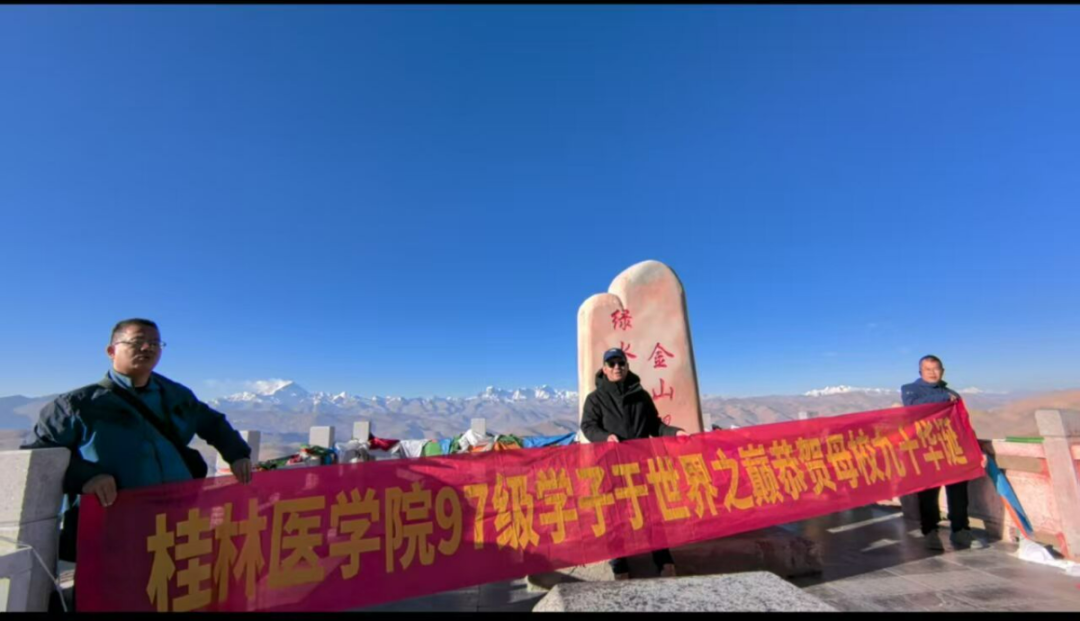 当日,珠峰脚下阳光洒在皑皑白雪上,折射出耀眼的光芒。虽然没有专业登山装备,但他们手中那面印着“桂林医学院97级学子于世界之巅恭贺母校九十华诞”的横幅却格外显眼。他们面向镜头,激动之情溢于言表。其中一位校友感慨地说:“从踏入桂医校门的那一刻起,桂医的精神就深深烙印在我们心中。如今母校90岁生日,我们选择在珠峰,向培育我们的母校表达最崇高的敬意。” 他们轮流诉说着对母校的感恩,回忆着在校园里的青春岁月,那些课堂上的求知若渴、宿舍里的彻夜长谈、实习时的相互鼓励,每一个画面都历历在目。