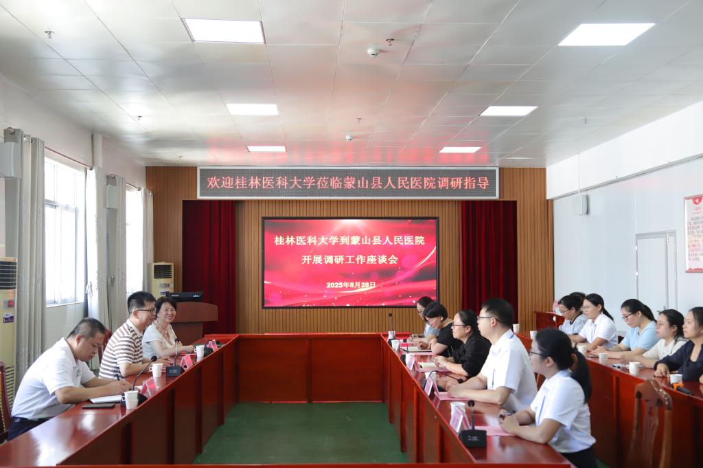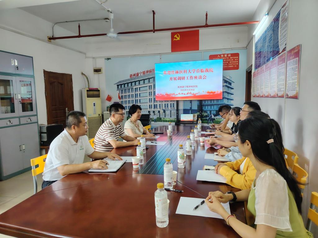 走访调研首日,工作组马不停蹄开展走访。上午抵达蒙山县人民医院,深入临床科室与职能部门,详细了解医院学科建设、人才培养等情况,听取桂医校友在院工作成长反馈;下午前往梧州康宁精神病医院,聚焦精神卫生领域发展现状,与院方及校友就专业人才培养、临床科研合作等议题深入交流。