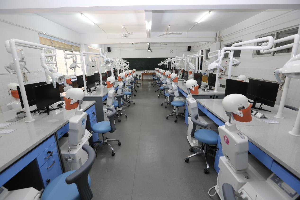 近年我院办学条件明显改善,学校投入了550万用于我院部分教学实验室设备的更新,实验室从乐群搬迁到东城后,面积扩大到了860平米。2018年8月我院获“2018-2020年度广西本科高校特色专业及实验实训教学基地(中心)一体化建设项目”,得益于该项目1000万元建设经费,我院完成了口腔临床技能实验室全面升级改造,综合模拟评估教室、虚拟仿真实验室的装修建设。目前口腔医学教学实验中心共有仿真人头模教学系统(“日进”Ⅰ型)63套、口腔实验教学实习评估系统(日进FairGrader 2000)1套、口腔显微教学机1套、数字口腔教学示教系统3套,实现学生实验课一人一机、实验室全面覆盖示教显示,并可开展显微根管教学,对学生实操作品进行数字化标准评分和指导反馈。实验教学设备的更新换代,为我院教育教学工作提供坚强保障。