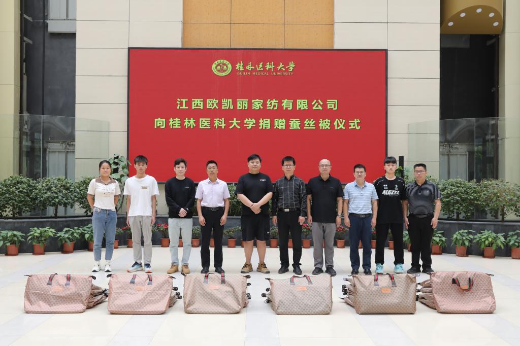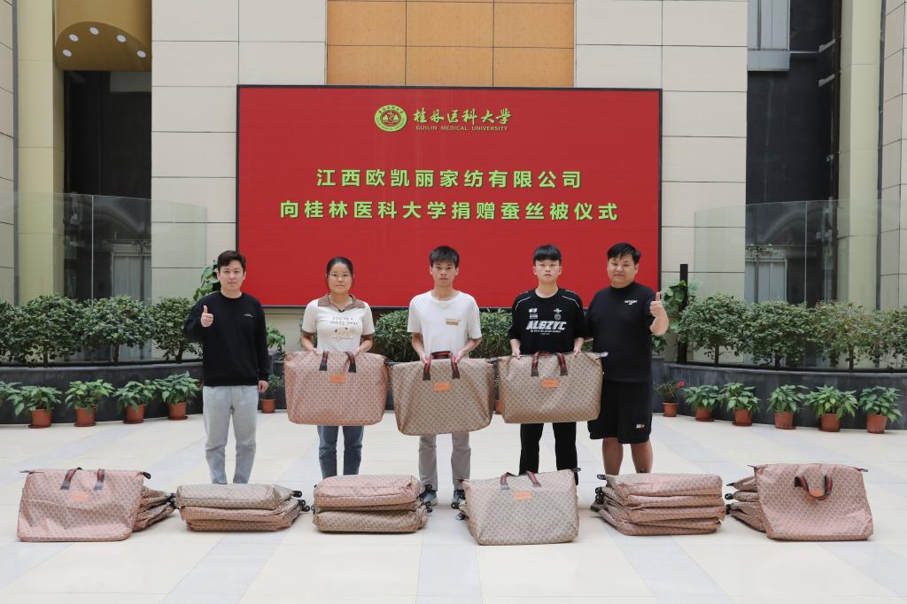 4月17日上午,一场洋溢着温暖与爱心的捐赠仪式在桂林医科大学临桂校区圆满举行。江西欧凯丽家纺有限公司慷慨解囊,向桂林医科大学捐赠100床蚕丝被,为广大学子送来了暖心的关怀。江西欧凯家纺公司桂林分公司总经理潘俊副总经理雷琪学校教育发展基金会、校友办、学生工作处(部)、乡村振兴办、工会等部门负责人及在校生代表共同参加此次活动。
