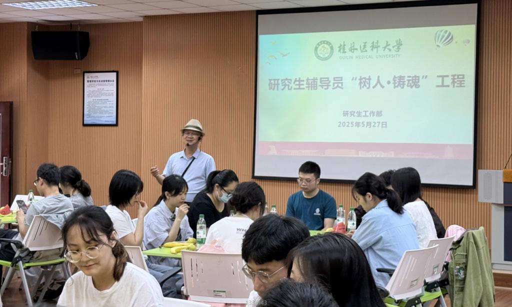 为助研究生纾解科研压力、培养积极心理品质,5 月 27 日下午,研究生工作部在大学生活动中心 210 教室举办“弘德善医” 大讲堂暨研究生辅导员“树人·铸魂”工程活动,特邀桂林电子科技大学邝宏达博士授课,研究生工作部领导、老师、辅导员及研究生代表参加。