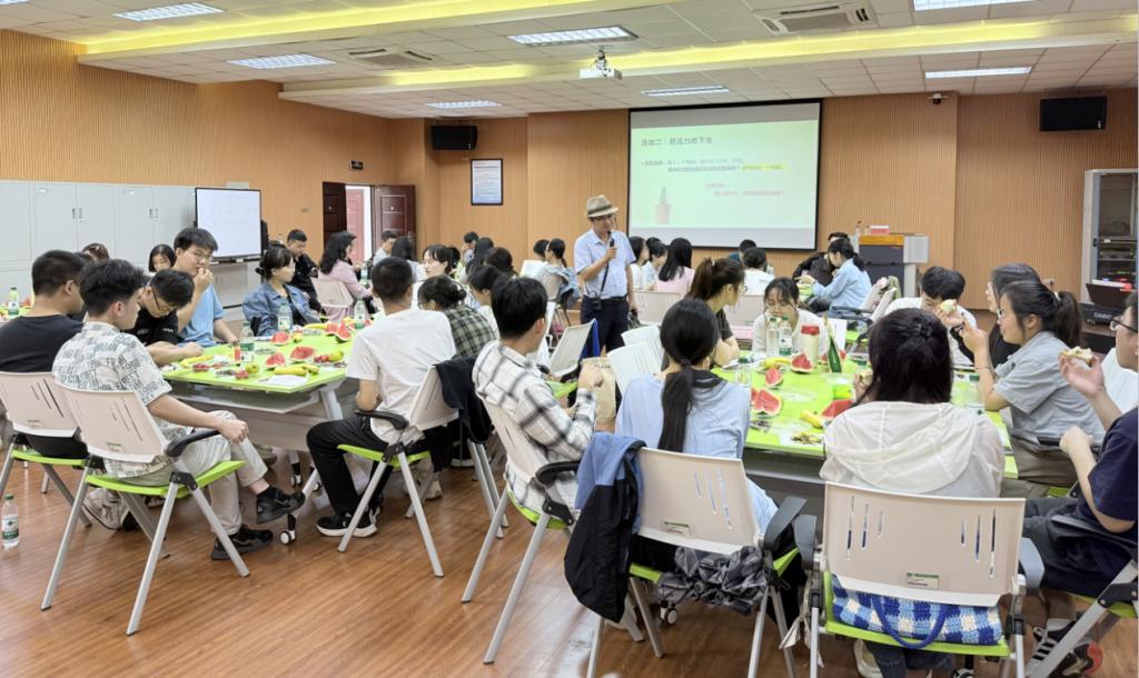 活动以 “学术水果减压大餐” 为主题,设 “目标解码”“压力转化”“烦恼清空” 三大环节。邝博士将瓜子、水果与科研场景结合,引导学生在趣味互动中探索科研目标管理、压力转化等关键问题,助力掌握压力调节技巧,激发创新动力。